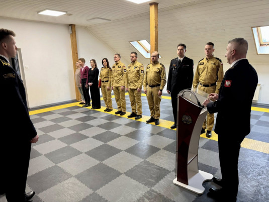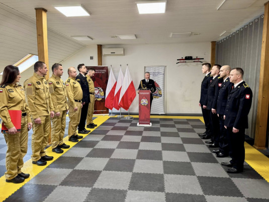Komendant Powiatowy PSP w Lesku, bryg. Robert Wojciechowski, powitał wszystkich zebranych i podziękował strażakom za codzienny trud, profesjonalizm oraz zaangażowanie w nowe zadania, jakie stawia przed nimi Państwowa Straż Pożarna, w tym działania związane z ochroną ludności i obroną cywilną.